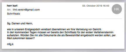 Hallo. Du sag, ihr habt doch grad mit dem Anwalt gesprochen, oder? Vergiss nicht, er muss sich unbedingt die Statuten anschauen. Hab die letztens bei den Förderungen abgelegt. Scann die ein und schick sie ihm per mail!