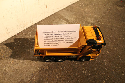 ... Für diejenigen unter Ihnen die heute bei dem Termin nicht anwesend sein konnten: der Streitwert wurde drastisch reduziert und beträgt jetzt nur mehr 12x800Euro nicht wie von uns gewünscht 12x2400Euro. Das Prozessrisiko, ist damit deutlich geringer als gedacht. Das spielt natürlich vor allem der Gegenseite in die Hände. Dazu kommt, dass sich ein solches Verfahren - wie sie ja wissen - sehr lange hinziehen kann. Damit sie dennoch zügig mit den Umbauarbeiten beginnen können, und ihr Projektziel im vorgesehen Zeitplan erreichen, schlage ich vor den Druck zu erhöhen. Was sind also unsere Optionen? ...