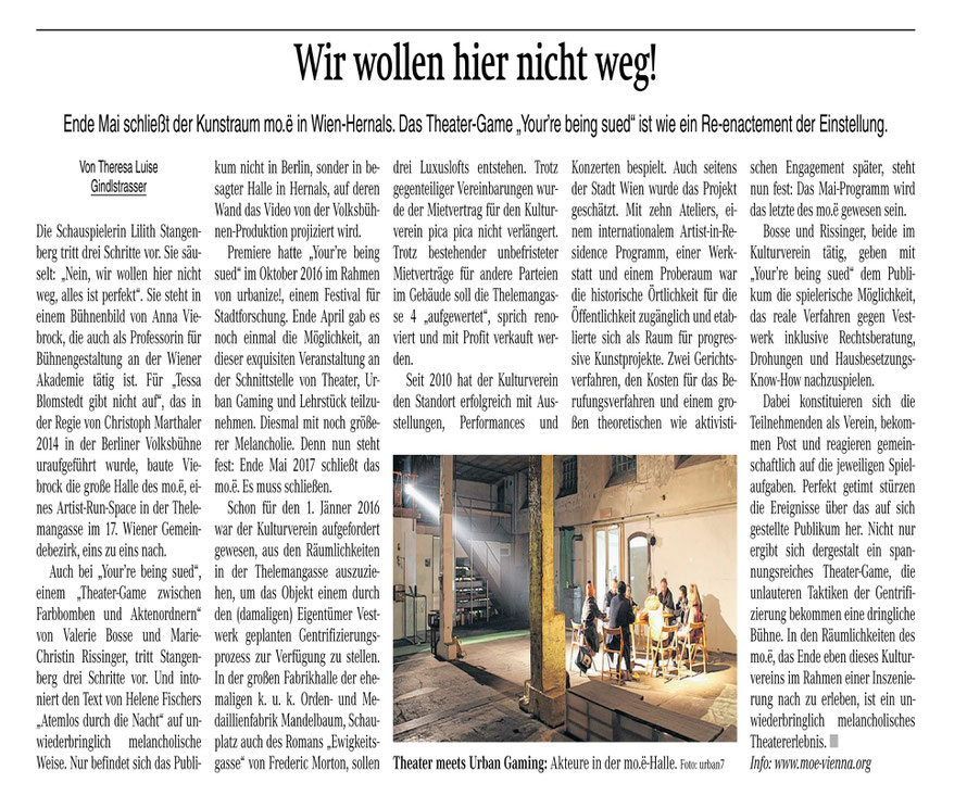 Ende Dezember 2015 sollten die Räume des mo.ë an den Investor rückgestellt werden, doch der Verein pica pica hat sich entschlossen zu bleiben und befindet sich mittlerweile in einem Gerichtsverfahren. Denn der Investor hat geklagt. Mit dem Entschluss zu bleiben will das mo.ë einen öffentlichen Diskurs zu Raumfragen, Kulturpolitik und Investorenlogik anstoßen: Es gilt sich einem Prozess zu widersetzen, der allzu oft unaufhaltsam dargestellt wird.
